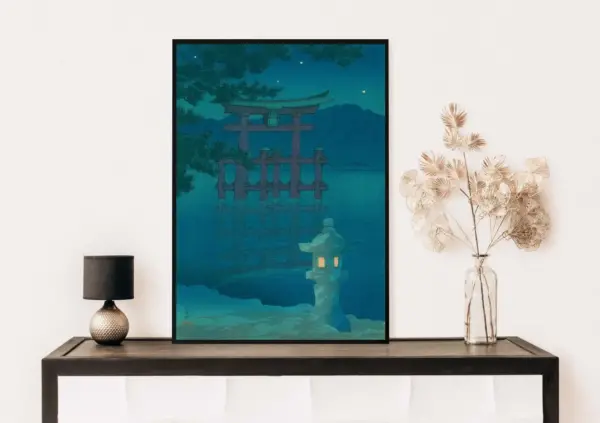 Stunning vintage-style Japanese art print featuring Hasui Kawase's iconic "Starlit Night at Miyajima." Perfect wall art for any home decor. High-quality print on premium paper.