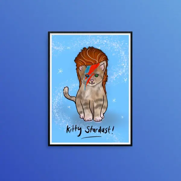 Celebrate David Bowie's iconic Ziggy Stardust with this unique cat art print. A purrfect gift for Bowie and cat lovers! High-quality print featuring a stylish feline.