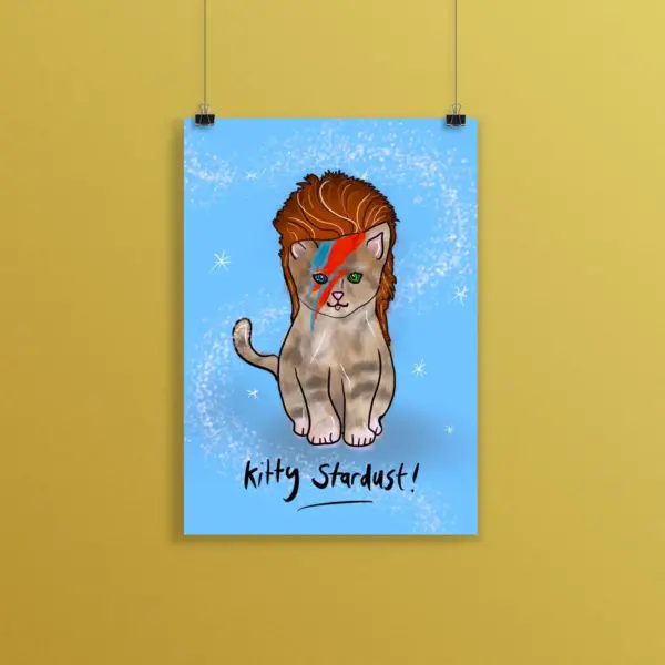 Adorable cat illustration featuring a Ziggy Stardust-inspired kitty. Perfect for cat lovers and David Bowie fans! High-quality print on various products.