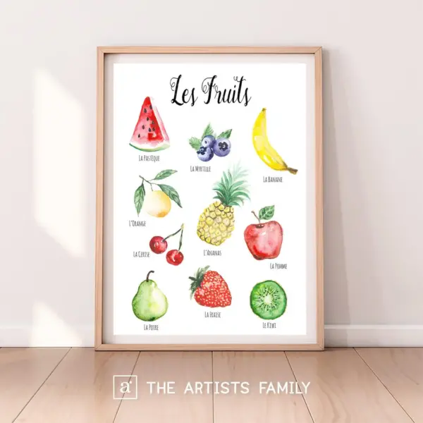 Les Fruits French Educative Downloadable Prints Watercolor Montessori Educational Poster Kids Children Room Learning Painting Food Kitchen