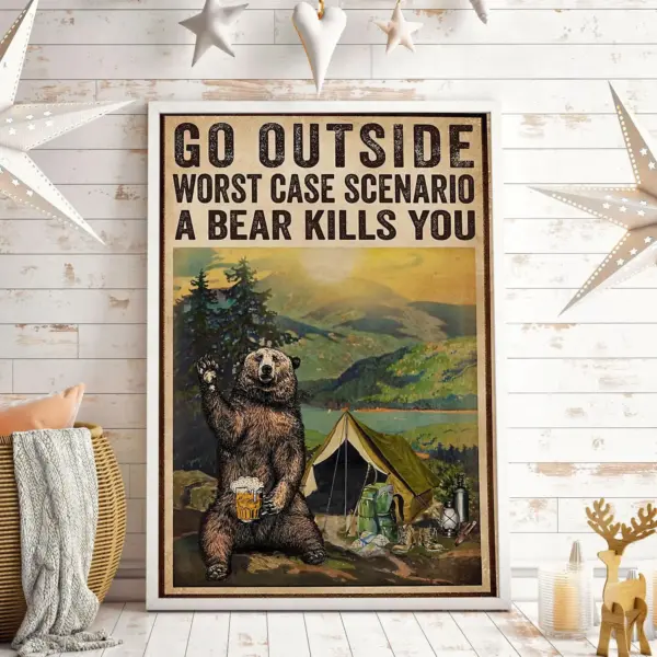 Capture the spirit of wilderness with this vintage-inspired camping poster featuring a charming bear illustration and nostalgic outdoor exploration theme.