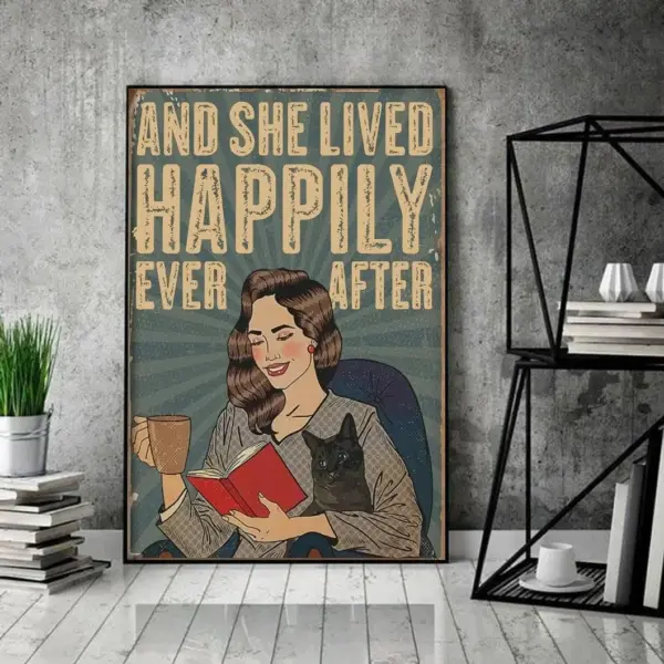 Love Cat Poster Reading Book Poster Girl And Cat Reading Book Poster And She Lived Happily Ever After Poster Cat Lover Gift Wall Art Framed Matte Canvas
