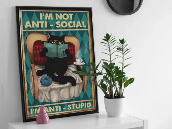 Love Cat Poster Reading Books Poster Cat Reading Book Poster I M Not Anti Social I M Anti Stupid Poster Cat Vintage Home Signs