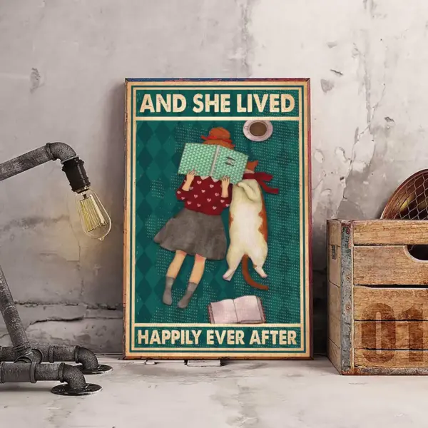 Love Reading Book Poster And She Lived Happily Ever After Poster Cat Lovers Vintage Book Canvas Girl Loves Book And Cat Art Print Q