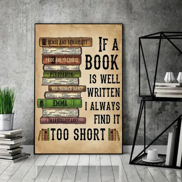 Love Reading Book Vintage Poster If A Book Is Well Written I Always Find It Too Short Vintage Poster Jane Austen Novel Books Poster