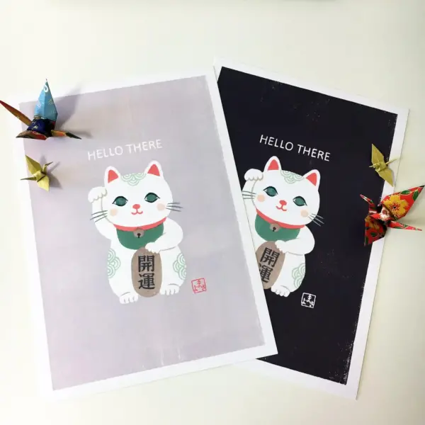Maneki Neko Woodblock Print - Japanese Lucky Cat Wall Art