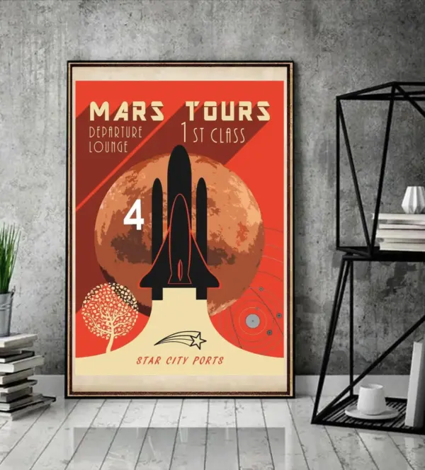 Vintage-style space travel posters featuring Apollo 4, Mars, and stunning star cityscapes. Perfect for retro decor and space enthusiasts. High-quality prints for your departure lounge or home.