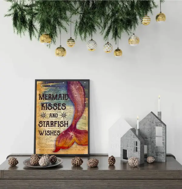 Beautiful vintage-style mermaid art print. Perfect beach wall decor featuring mermaid kisses, starfish wishes, and ocean themes. Summer vibes guaranteed!