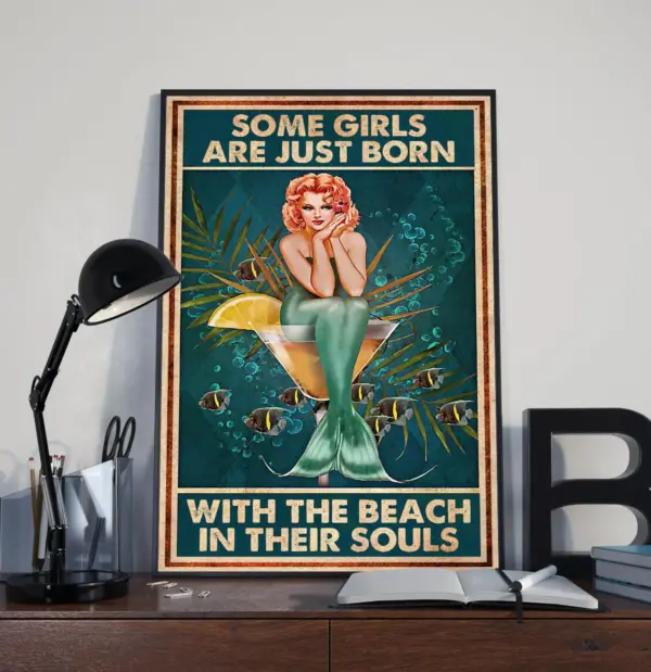 Mermaid Poster Some Girls Are Just Born With The Beach In Their Souls Funny Mermaid Art Prints Whiskey Wall Art Beach Lovers Canvas