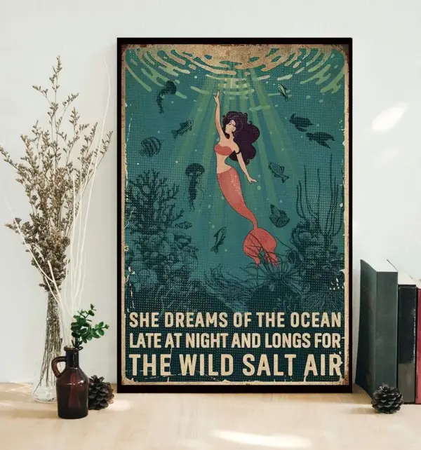 Mermaid She Dreams Of The Ocean Late At Night Poster Canvas