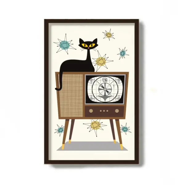 Mid Century Modern Art Black Cat Art Print Print Atomic Art Living Room Wall Art Cat Lover Gift Retro Tv Danish Modern