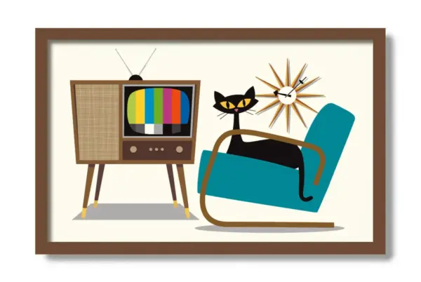 Mid Century Modern Art Black Cat Art Print Print Retro Wall Clock Living Room Wall Art Cat Lover Gift Retro Tv Danish Modern