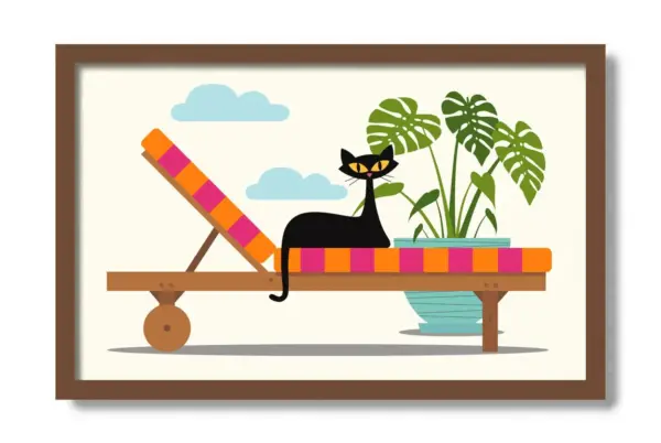 Mid Century Modern Art Black Cat Lover Gift Chaise Lounge Tropical Decor Monstera Plant Palm Springs Print Swimming Pool