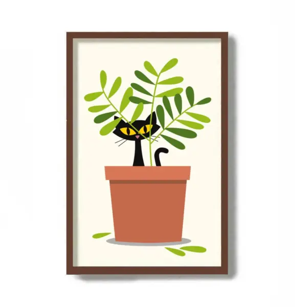 Mid Century Modern Art Black Cat Lover Gift Eucalyptus Plant Tropical Decor Minimalist Wall Art Black Cat Art Florida Decor Print