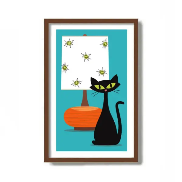 Stylish mid-century modern cat wall art. Atomic starburst design. Perfect gift for cat lovers! Includes a table lamp.