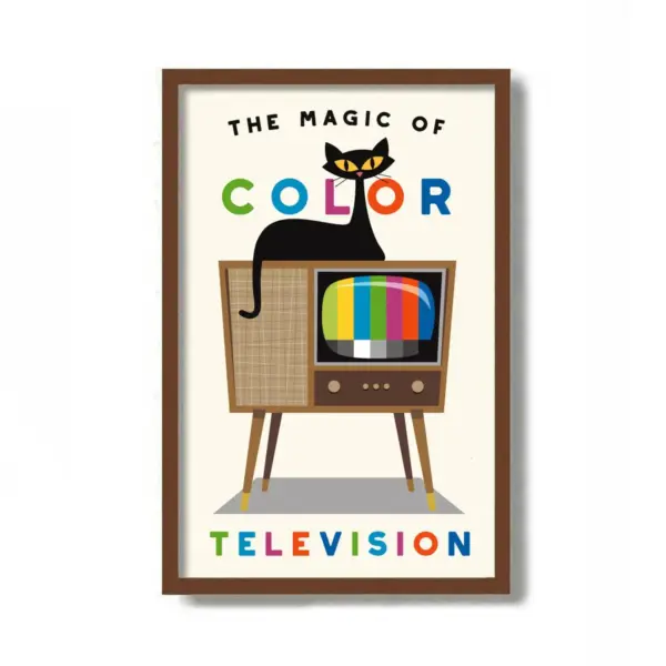 Mid-Century Modern Black Cat Art Print - Retro TV Wall Decor