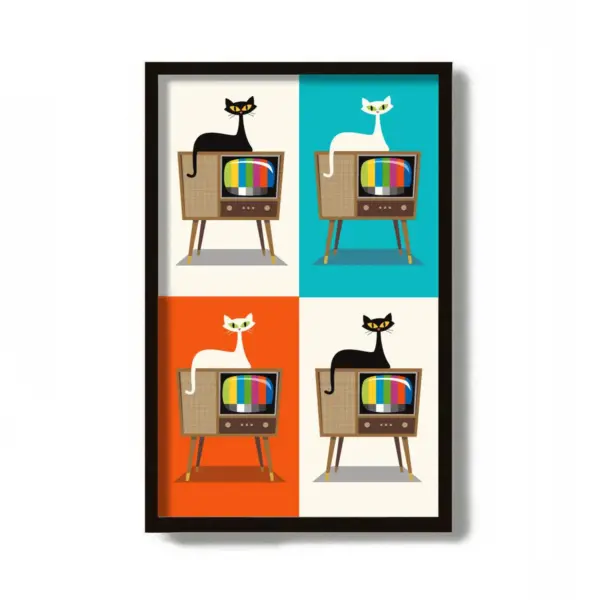Mid Century Modern Art Print Black Cat Decor Print Living Room Wall Art Cat Lover Gift Retro Tv Danish Modern White Cat Art