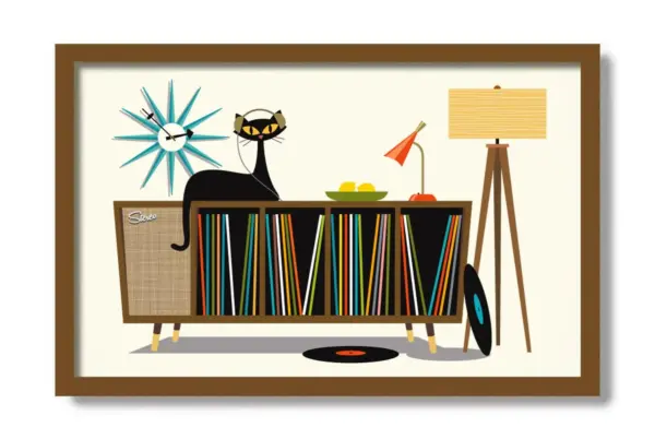 Retro-inspired art print featuring a stylish black tabby cat design, perfect for mid-century modern decor and vinyl record enthusiasts. Unique wall art gift.