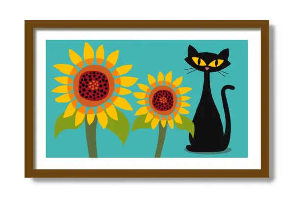 Mid Century Modern Art Print Sunflower Decor Cat Lover Gift Black Cat Art Tabby Cat Garden Cat Veterinarian Gift Flower Print
