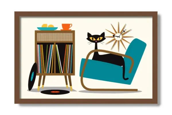 Mid Century Modern Art Record Player Stand Black Cat Art Print Cat Poster Cat Lover Gift Vinyl Record Storage Retro Record Player