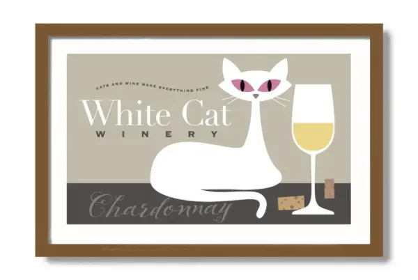 Mid Century Modern Art White Cat Art Print Wine Lover Gift Cat Lover Gift Wine Gift For Women Chardonnay Gifts Wine Glasses