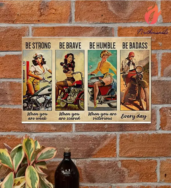 Inspiring motorcycle-themed wall art featuring a motivational message to encourage bravery and resilience, perfect for home or office decoration.