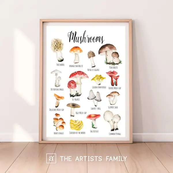 Mushrooms Toadstools Downloadable Prints Watercolor Montessori Educational Posters Kids Boys Girls Children Rooms Learning Illustration