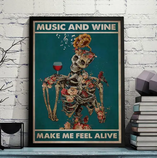 Music And Wine Make Me Feel Alive Poster Skeleton Poster Music Lover Wine Lover Gift Wine Poster Funny Skeleton Canvas Print Retro Art