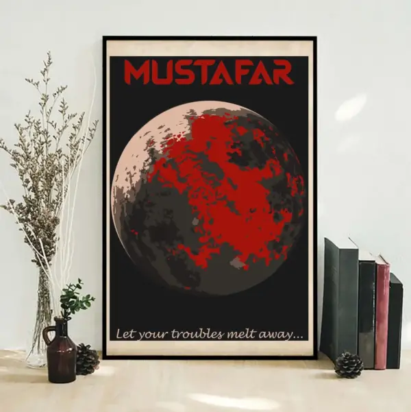 Escape to Mustafar! This retro-style Star Wars poster features Darth Vader's iconic castle on the volcanic planet. Perfect for any Star Wars fan's travel-themed decor!
