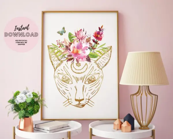 Beautiful floral cat wall art perfect for cat lovers and those interested in celestial, zen, and spiritual themes. Featuring a mystic cat design with moon and stars.