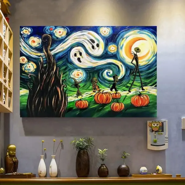 Spooky Starry Night Halloween poster featuring Nightmare Before Christmas design. Perfect wall art decor or gift for fans. High-quality print.