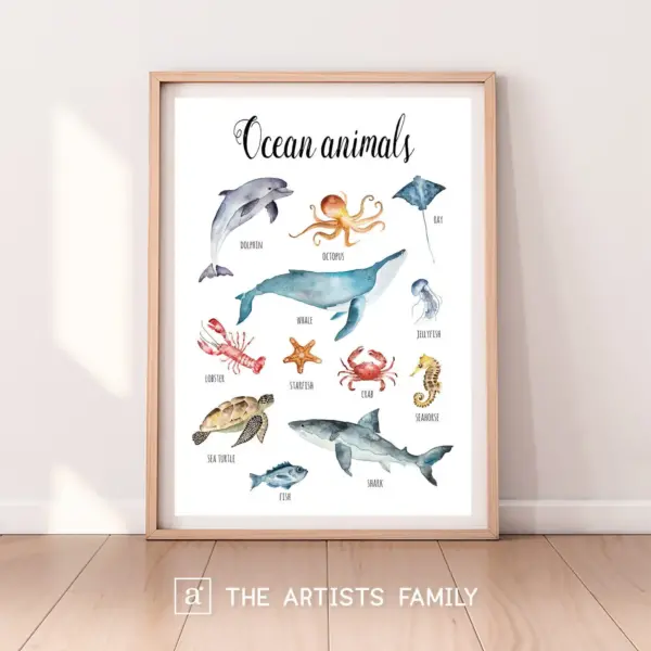 Ocean Animals Downloadable Prints Watercolor Montessori Educational Poster Kids Boys Girls Children Rooms Learning Painting Illustration Sea