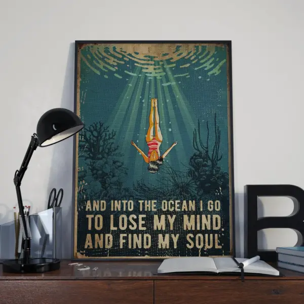 Ocean Girl Poster And Into The Ocean I Go To Lose My Mind And Find My Soul Ocean Diving Art Print Retro Vintage Swimming Poster Wall Art