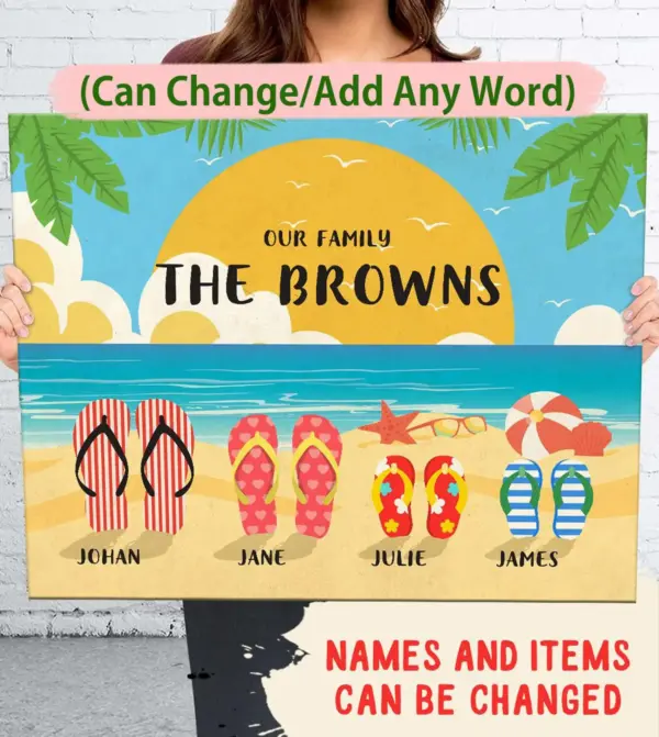 Our Family Beach Flip Flops Canvas Custom Name Ocean Sand Parents And Kid Names Wall Art Hang Print Poster Family Home Decor Housewarming