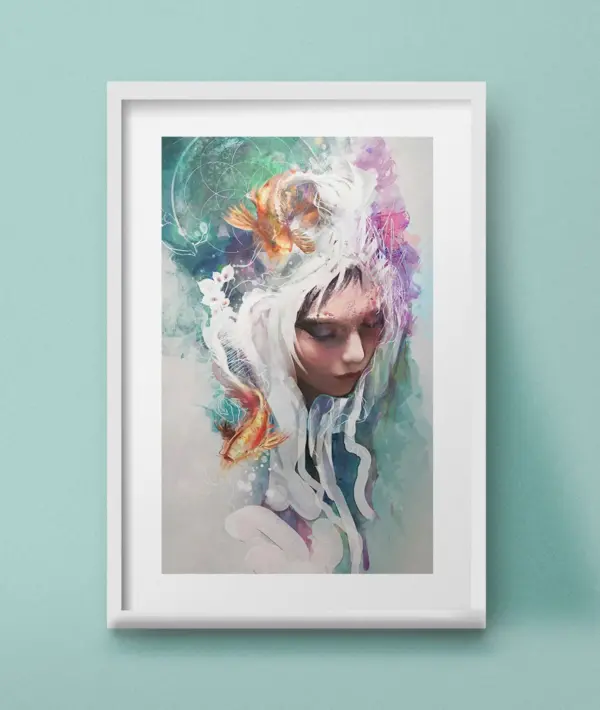 Painting Female Portrait Art Print Koi Fish Abstract Flowing Flowers Water