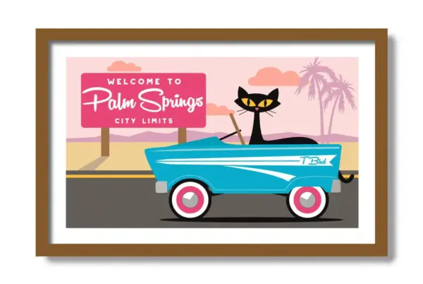 Palm Springs Poster Mid Century Modern Wall Art Black Cat Art Print Cat Lover Gift Toy Pedal Car Desert Decor Southwestern Print