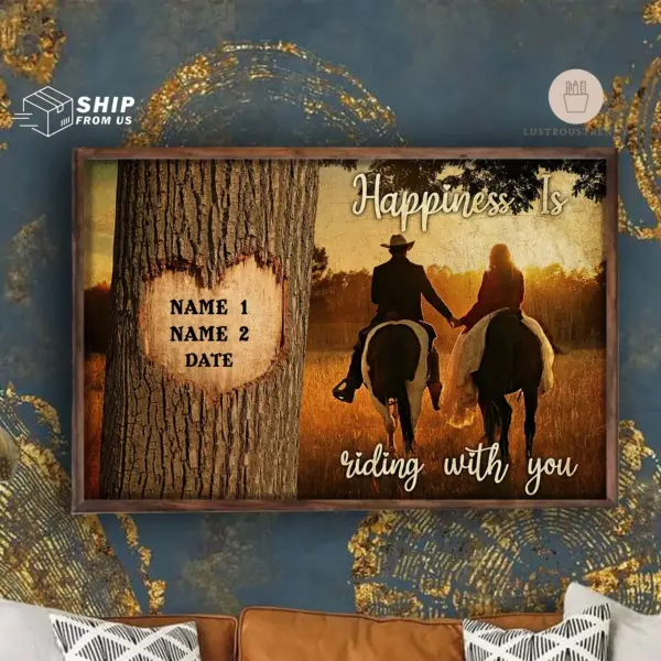 Personalized Custom Names And Date Gifts Cowboy Cowgirl Couple Poster Happiness Is Riding Poster Valentine Day Gifts Home Decor Poster