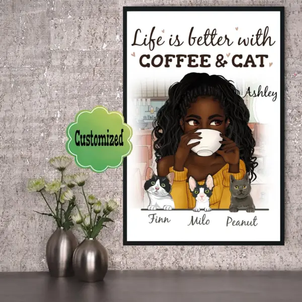 Personalized Life Is Better With Coffee And Cat Poster Cat Lover Wall Art Cat Lover Gifts Black Girl Magic Canvas Custom Cat Wall Art