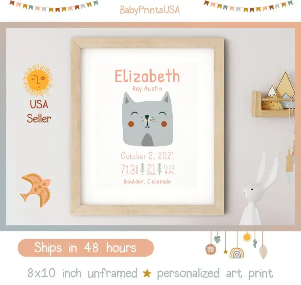 Personalized Newborn Baby Birth Name Detail Stats Lil Kitty Cat Kitten Lover Theme Unique Wall Art Custom Colorful Cute Gift Idea 8 Print
