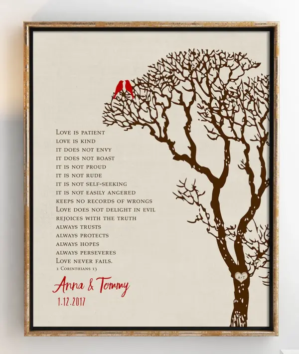 Personalized Wedding Gift Family Tree Art Love Birds In Tree With Carved Initials And Names Wedding Date 8 Print