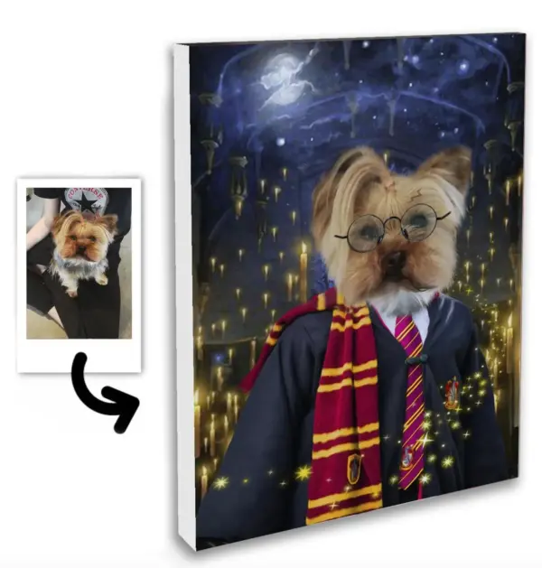 Personalized pet portraits on canvas, inspired by Harry Potter. Unique wall decor & perfect gift for pet lovers. Custom pet art, canvas prints.