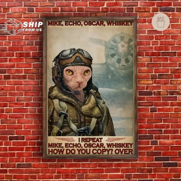 Unique wall art celebrating aviation passion and feline love, featuring military phonetic alphabet and skydiving inspiration for home or office decor.