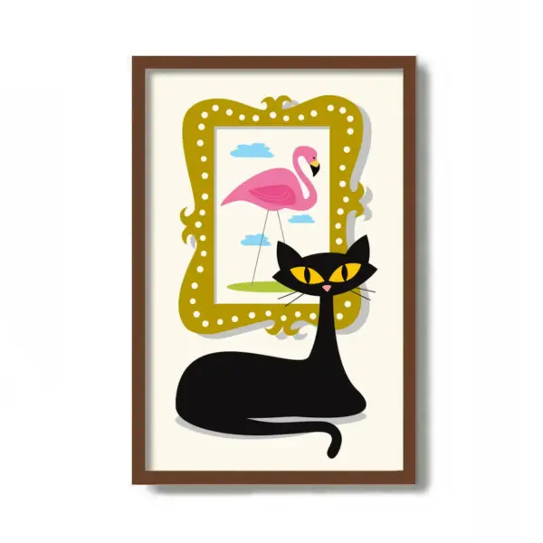 Pink Flamingo Art Mid Century Modern Art Cat Lover Gift Black Cat Print Kitsch Decor Mcm Wall Art Retro Poster Lawn Ornament