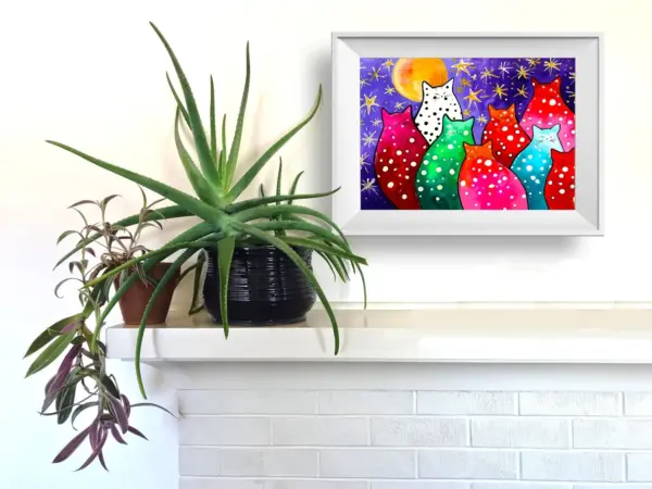 Adorable watercolor cat wall art featuring polka dot kitties, a moon, and stars. Perfect for cat lovers! Colorful abstract cat print for home decor.