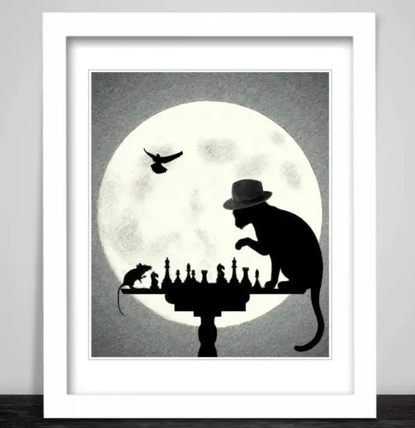 Printable Art Print The Cat Chess Master Full Moon Chess Game Cat And Mouse Vintage Painting Poster Print Artwork