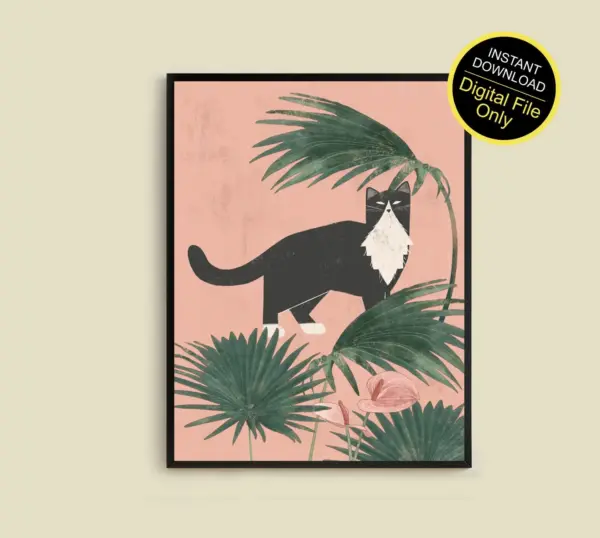 Printable Cat And Tropical Plants Poster Boho Cat Wall Art Cat Printable Artwork Black Cat Poster Cute Cat Print Cat Plant Illustration