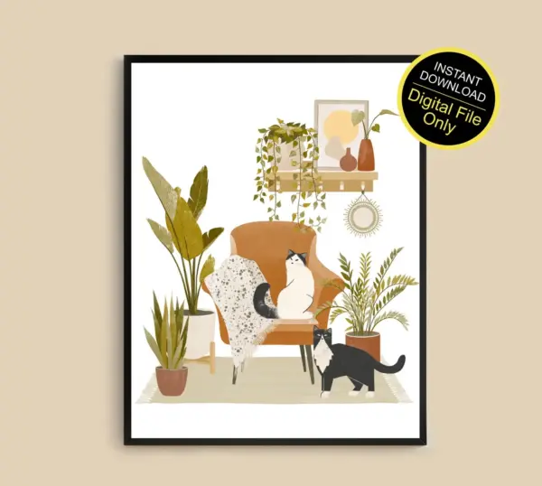 Printable Home Garden With Two Cats Wall Art Cat And Plant Illustration Cat Print Boho Cat Wall Art Abstract Cat Plant Poster