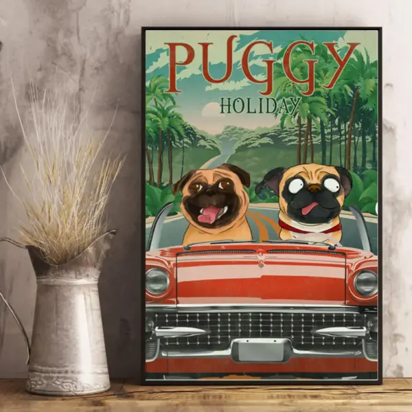 Puggy Holiday On The Red Car Vertical Poster Wall Decor Poster No Frame Dog Lover No Frame Poster Best Gift Art Wall Decor