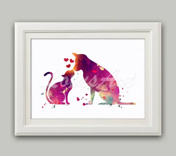 Purple Cat And Dog Love Watercolor Print Cat Wall Art Animal Nursery Art Cat Lovers Gift Dog Art Print Animal Lover Gift Wall Art Poster