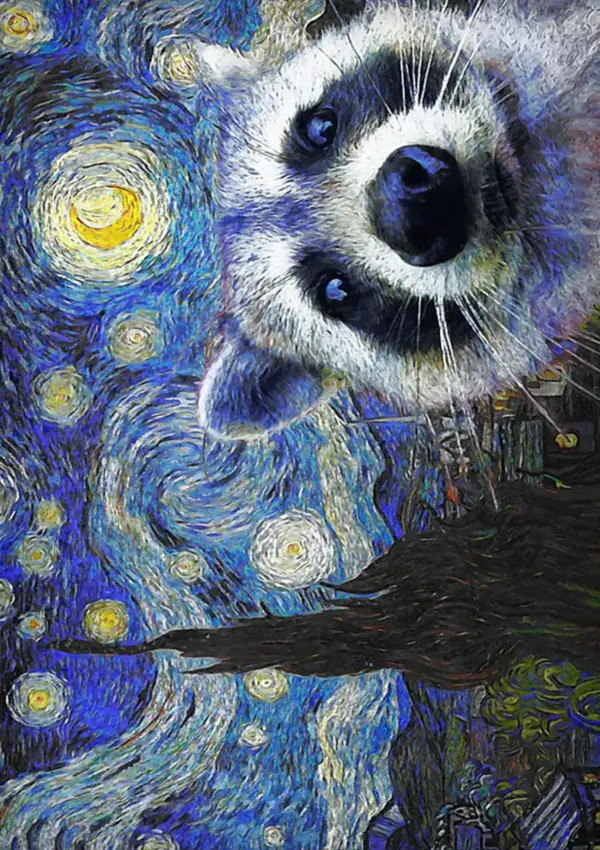 Beautiful raccoon art print featuring a starry night sky. Perfect for nature lovers and animal enthusiasts. High-quality poster print on durable paper.